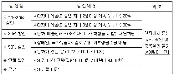 나. 이벤트 안내 1) 이벤트: [한이준 도슨트 초청 이벤트] 9.24.(일) 13/16시 * 사전예약 필수 2) 이벤트: [문화가 있는 날 10주년 이벤트] 10.1.(일)~10.3(화) 관객50% 할인 3) 이벤트: [20,000번째 입장 관객 이벤트] 헬가전시 도록 및 공연티넷 증정
