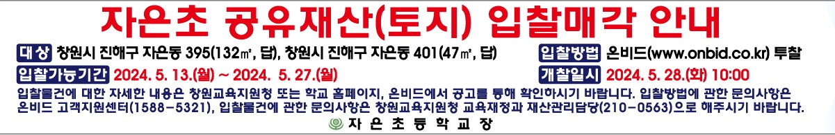 자은초 공유재산(토지) 입찰매각 안내 1. 대상: 창원시진해구 자은동 395 (132㎡, 답) 창원시 진해구 자은동 401(47㎡, 답) 2. 입찰방법: 온비드(www.onbid.co.kr) 투찰
